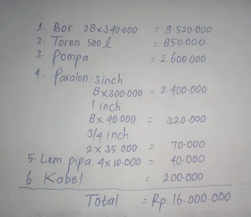 A. Pemasangan baru sumur bor sedalam 28 meter lengkap pipanisasi dan toren: