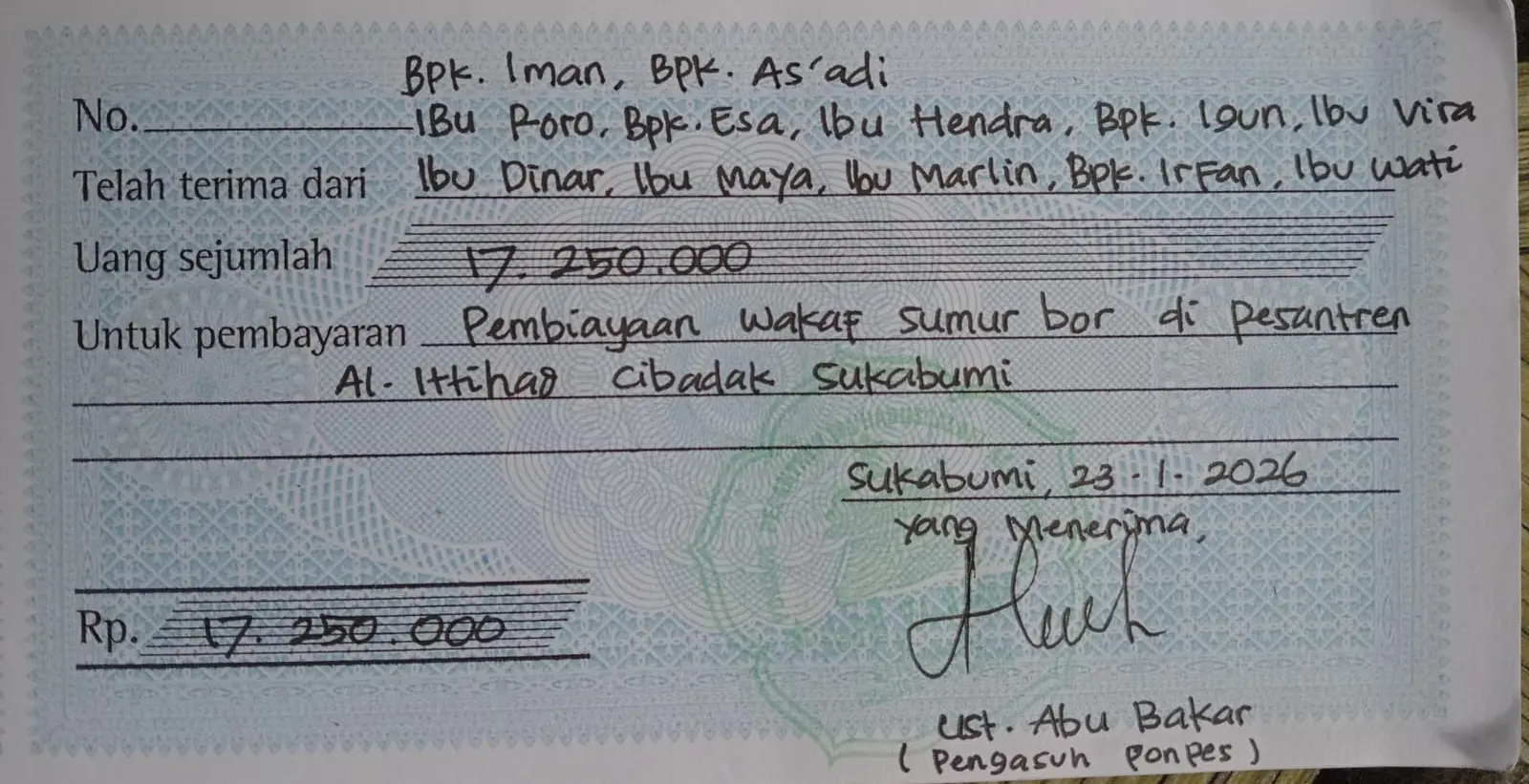 Terkumpul total dana Rp7 juta dari muhsinin di Jakarta, Bekasi, Purwakarta, Sukabumi, dan Bandung. Disalurkan untuk 4 Kelompok Target Amal di 4 Kota/Kab di Jawa Barat di Kab Sukabumi, Kota Bandung, dan Kab. Cianjur dengan rincian sbb: